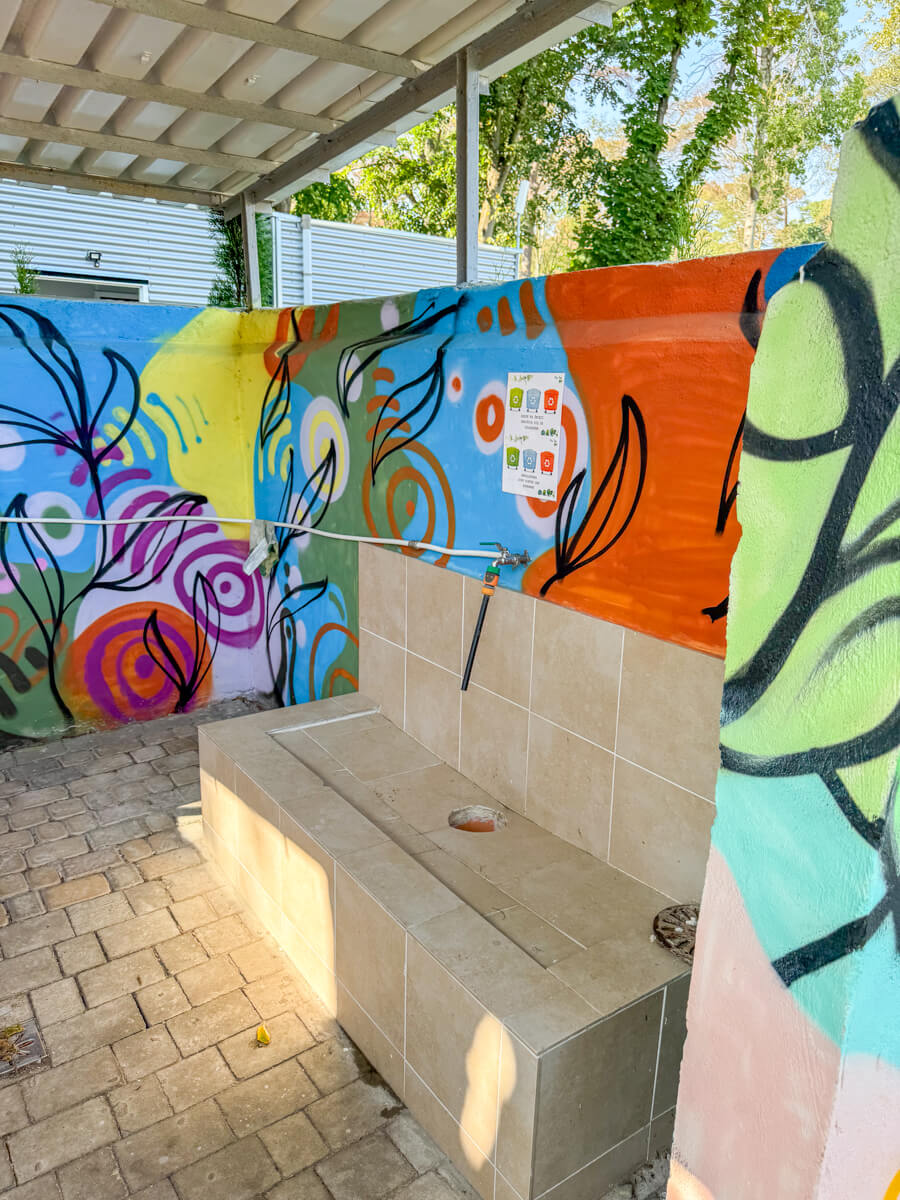 Die Campingplätze in Polen sind gut ausgestattet – Toiletten, Duschen und Waschmöglichkeiten sind fast überall vorhanden. Das ist praktisch, denn so könnt ihr die Ressourcen eures Wohnmobils schonen. Aber Vorsicht: Viele Campingplätze haben nur wenige oder gar keine Bodenrinnen, um das Schwarzwasser (den Fäkalientank) zu entsorgen. Wir haben deshalb oft mit einem Eimer gearbeitet, was manchmal genervt hat. Wir haben jedoch Tankstellen (ORTEN Tankstellen mit dem Bussard als Logo) gefunden, wo man hervorragend entsorgen konnte.
